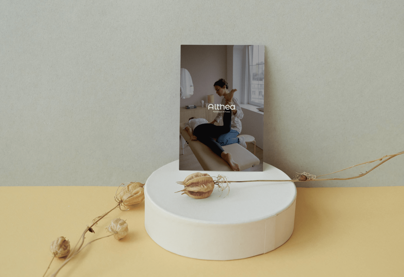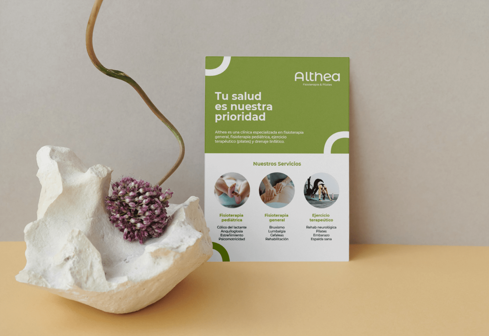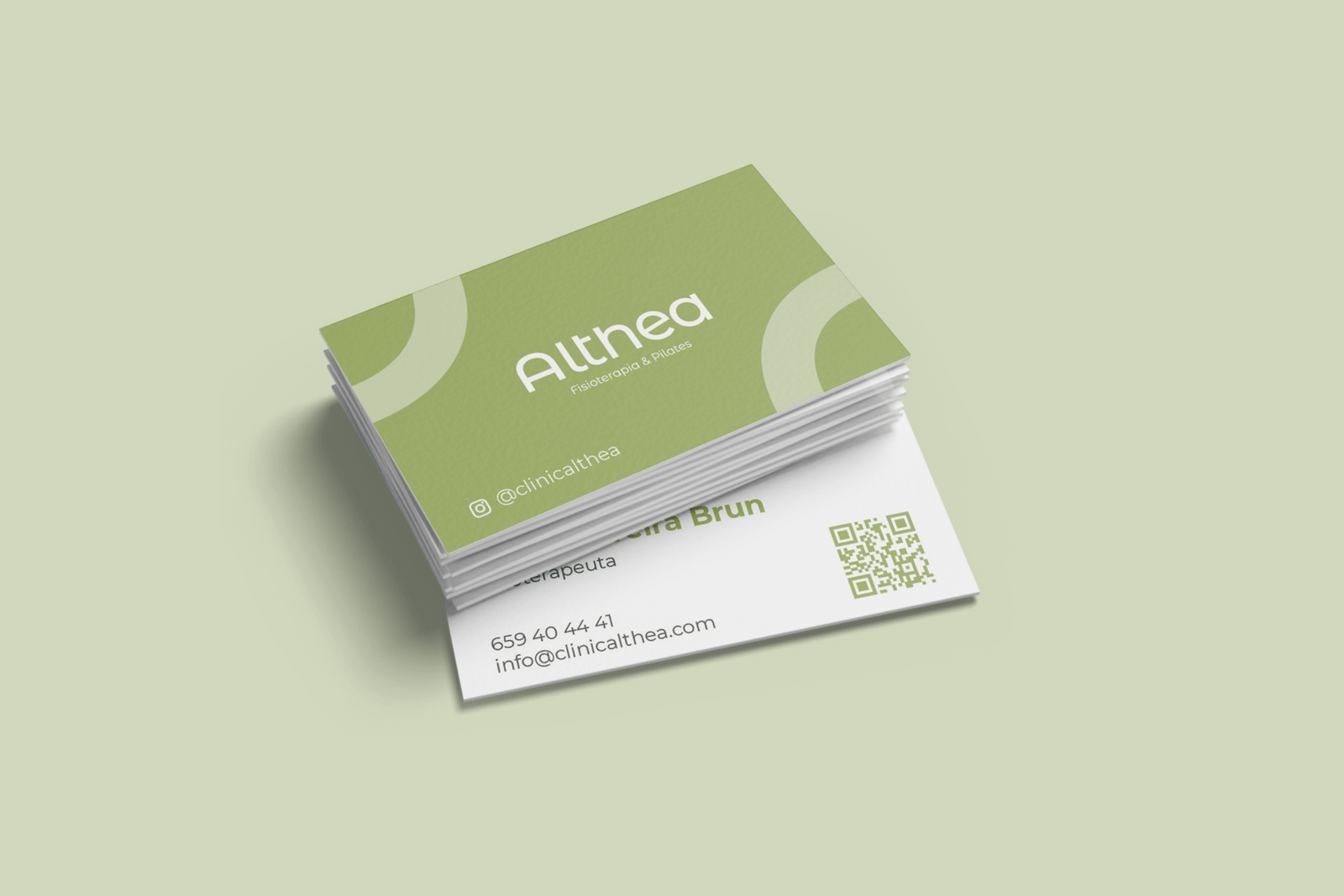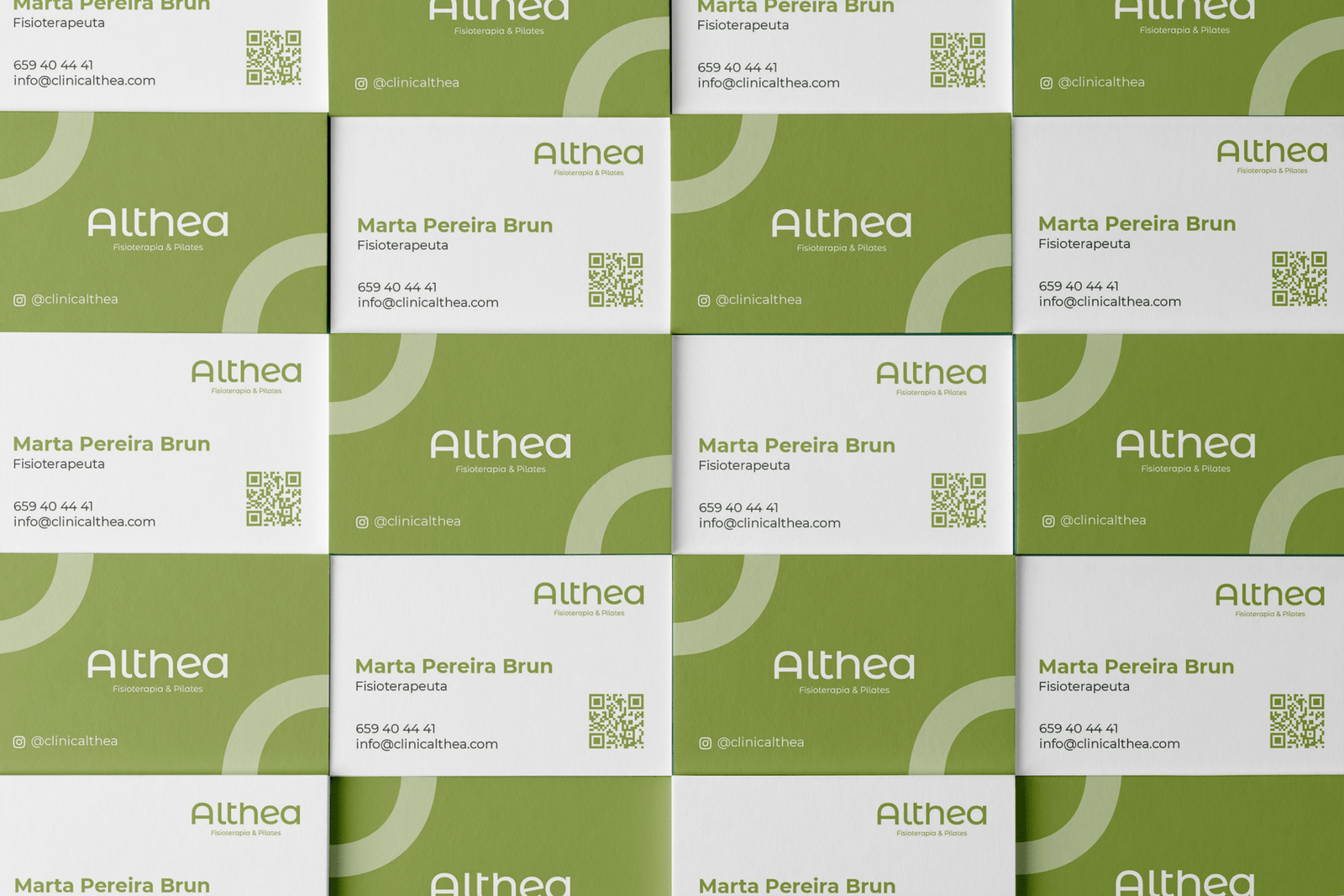 A identidade visual de Althea baséase nunha paleta de cores que reflicte equilibrio e benestar. O verde, cor principal da marca, simboliza saúde, renovación e vitalidade. O branco, pola súa parte, representa pureza, calma e confianza, creando unha sensación de serenidade e profesionalidade, fundamentais nun espazo dedicado ao coidado do corpo e da mente.